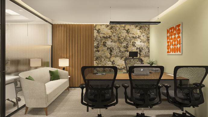 The Earthscape gallery captures the complete evolution of our design process—from the earliest 3D renderings to the final, fully realized on-site space. Each image tells a part of the story: how ideas conceived in digital form were meticulously translated into tangible environments. The earthy palette of greens and browns, thoughtful layouts, and attention to materiality come together to create a workspace that is both functional and visually harmonious. This gallery celebrates the transformation of concept into reality, showcasing our commitment to precision, creativity, and the seamless execution of design vision.